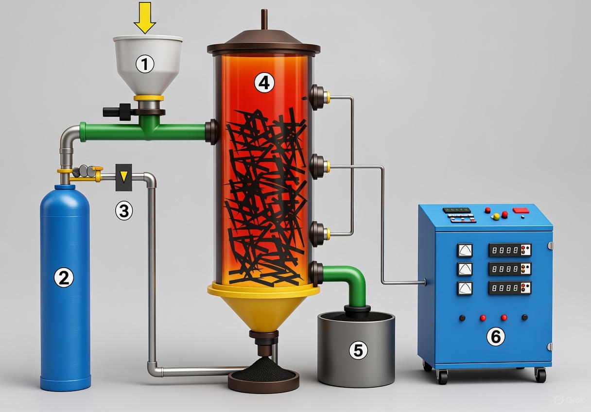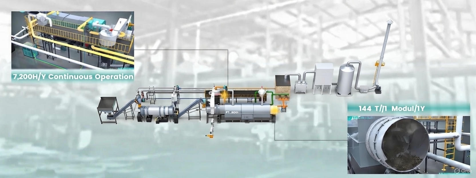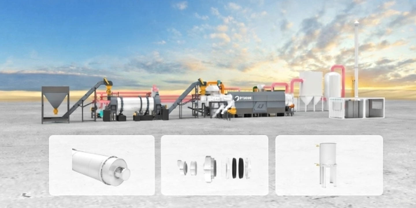 The pyrolysis equipment features a dual-cylinder heating structure enables multi-stage carbonization, with a processing capacity exceeding 400 kg per day/modul.